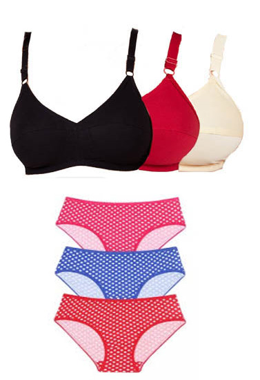3 Cotton Stretch Everyday Bra Free Mix N Match Panties which is exclusively paired for you. Made of cotton stretch, this bra is extremely comfortable to wear. This breathable fabric is ideal for Indian conditions. It makes you feel comfortable as you lead a modern lifestyle. This bra will enhance your bust size and will provide that perfect shape. This medium coverage daily wear cotton bra is ideal lingerie to keep you at ease for longer duration. Elasticized under band and edges ensure superior support and fit. Adjustable straps with sliders to adjust. Get 3 matching panties with these bras. These bras and free panties are available in 3 different colors so you can wear them with your outfit of choice.- Cotton bras provide a smooth shape and superior comfort