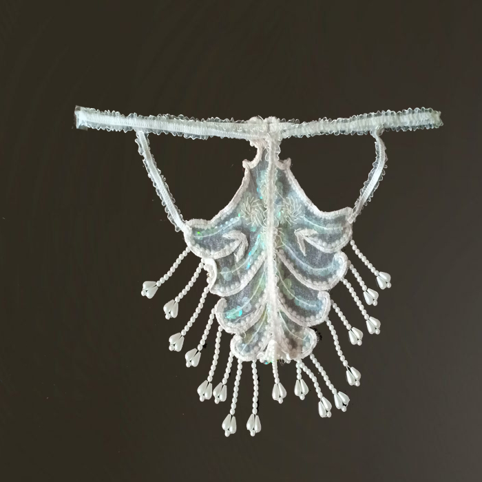 ✓SKU: bspwg02 ✓Color: White ✓Brief Size: L ✓Material: Polyester & Elastane ✓Features: All Pearl Details, Sexy Minimal Coverage ✓Style: G-String x