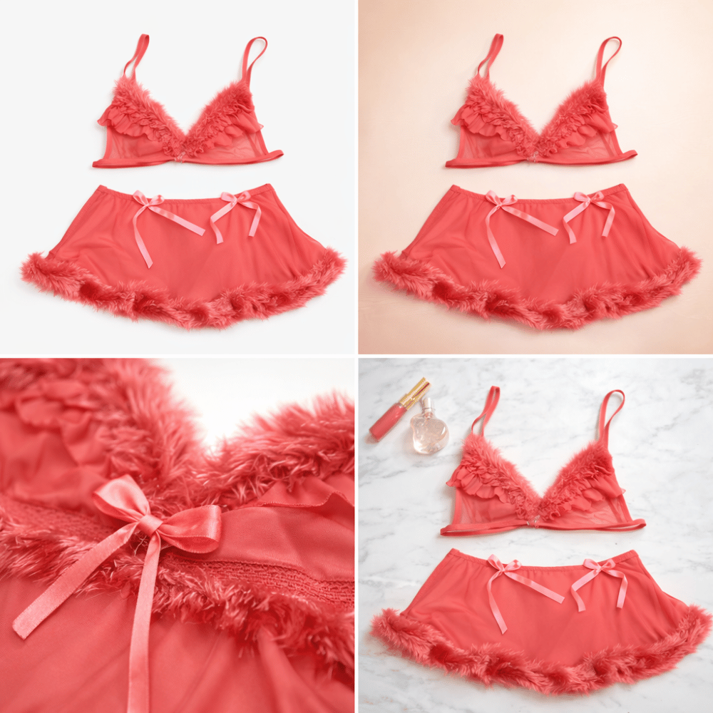 A soft and romantic sheer lingerie set in coral blush, featuring delicate feather trims and satin bows for a dreamy, feminine look.