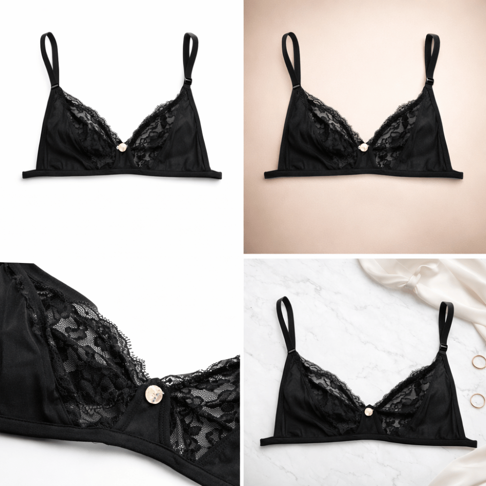 Black lace triangle bralette with sheer mesh cups and elegant gold charm detail. Lightweight, comfortable, and perfect for everyday luxury.