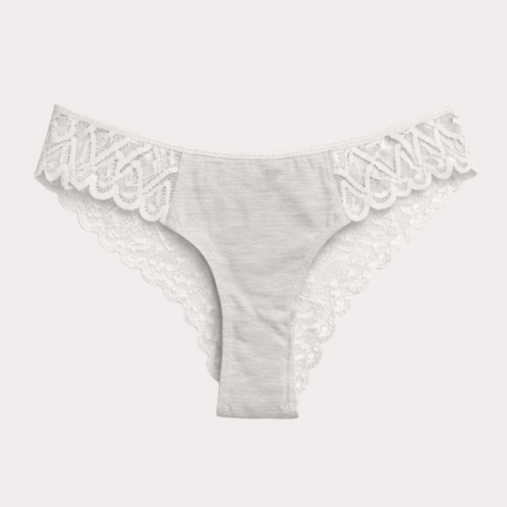 Elegant ivory grey cotton panty featuring delicate lace side panels and soft breathable fabric for comfortable everyday wear.