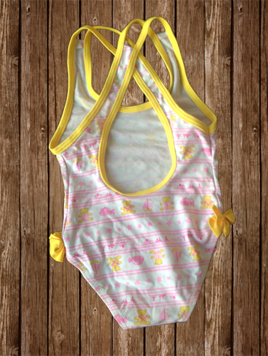 ✓ Fabric : 80% Polyamide and 20% elastane ✓ Size :  2 yrs. ✓ Color : Pink and yellow ✓ SKU : KidsSwimsuit#11 ✓Features: Floral Lace and satin bow at front, Sexy minimal back coverage ✓Pattern : Swimsuit