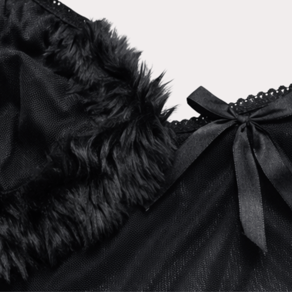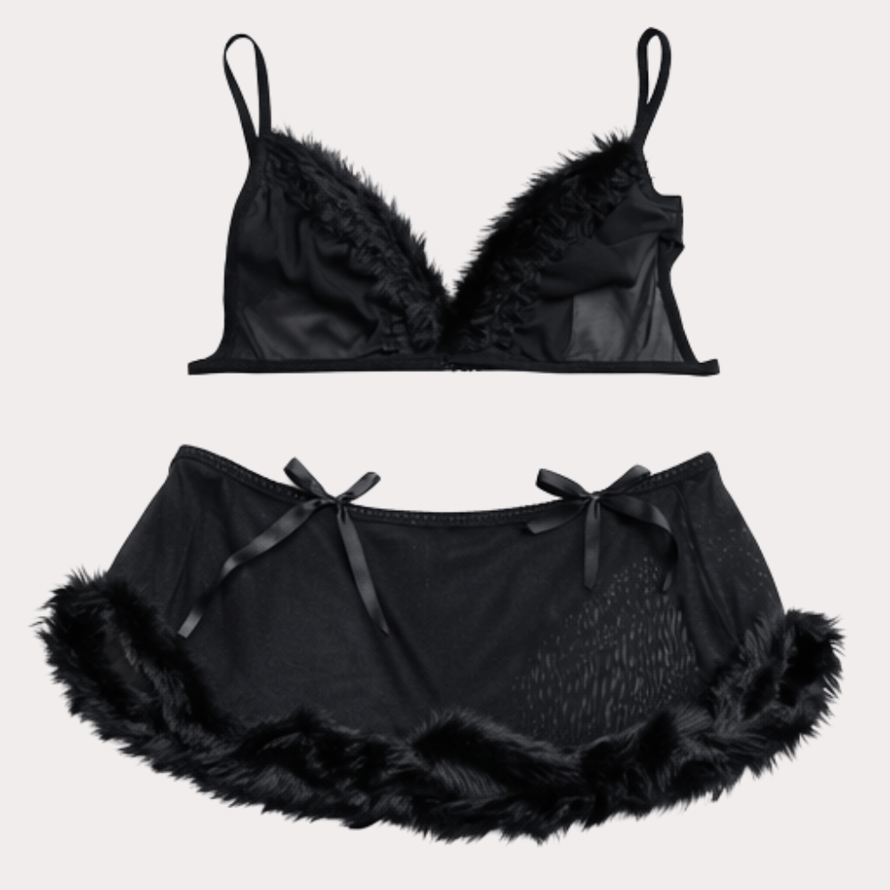 Black sheer lingerie set with feather trim detailing, featuring a soft bralette and flirty mini skirt for a bold, glamorous look.