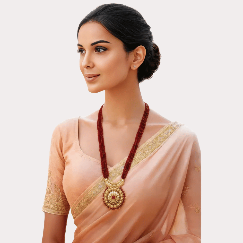 Make a graceful statement with this stunning temple-style necklace, designed to enhance your ethnic elegance. Featuring multiple strands of rich red beads, this piece is beautifully complemented by an intricately crafted antique gold pendant with a classic circular design and subtle stone detailing.