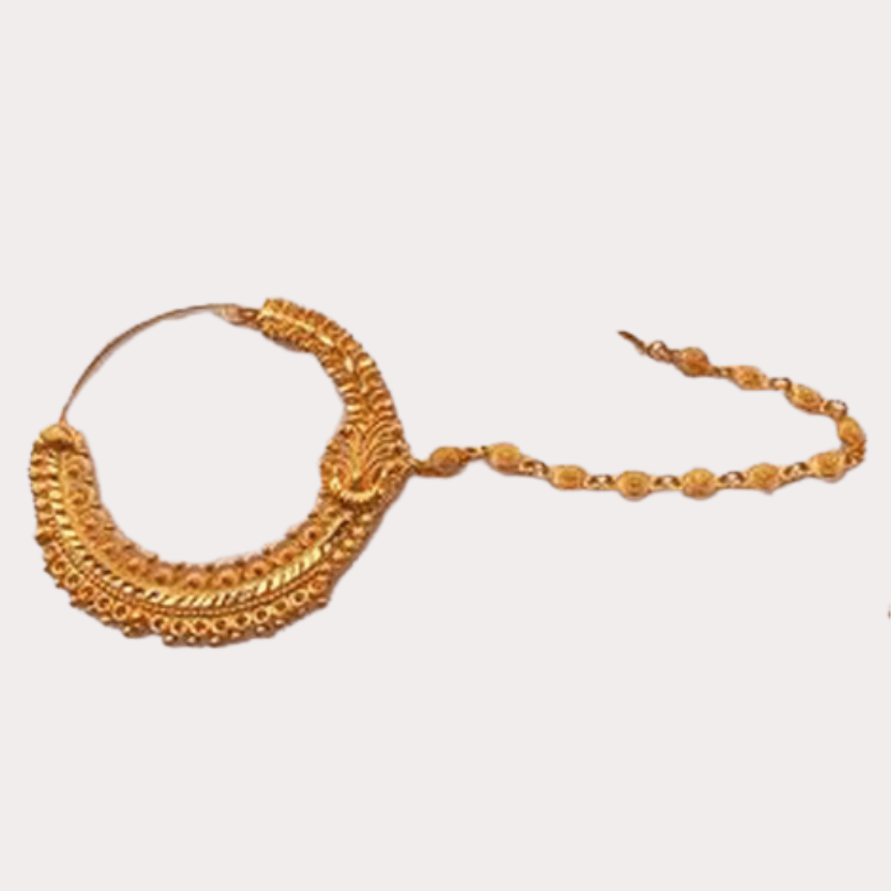 Classic gold-toned bridal nath with attached chain, featuring intricate traditional detailing—perfect for weddings and festive occasions.