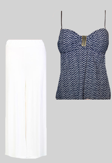 Trendy Zig-Zag Crop Top And White Palazzo Bottom are perfect introduction to your summer wardrobe. These stylish and comfortable palazzo are styled with an extra-wide, ruched waistband. Wide, loose Flare finish these chiffon-stretch pants with a modern fit. This cami features navy print, bandeau design with padded cup and detachable straps. This 72% polyamide with shelf bra also has elastane for a more comfortable fit. The detachable straps offer a more styles such as criss-cross, one shoulder, strapless and more; it also gives personalized fit. Metal at the center with pretty shirring will complement any outer paired with it.